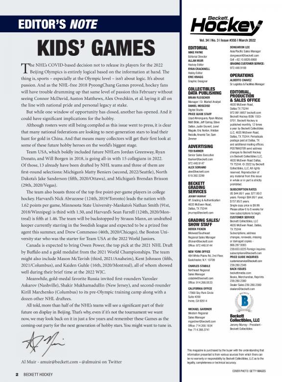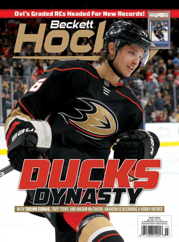 Beckett Hockey is a monthly magazine that features values on trading, including new releases. There are also articles on current trends, the latest releases and reviews of just-released products. Passionate readers use this magazine to find the worth of their cards, hot player and Rookie Cards to watch. Beckett Hockey is deal for longtime and novice collectors. Each issue has: • The Hockey Card Price Guide with more than 100 pages filled with values for past current releases. • The Hot List, a monthly guide with pricing and images for the top 20 hockey cards on the market • Articles with information on the latest trends and news in the hobby • Reviews of the latest hockey releases • Previews of upcoming products