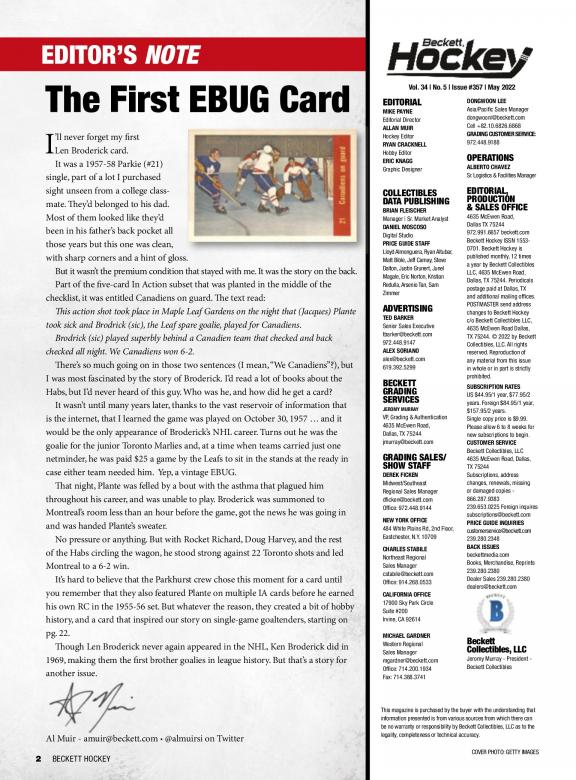 Beckett Hockey is a monthly magazine that features values on trading, including new releases. There are also articles on current trends, the latest releases and reviews of just-released products. Passionate readers use this magazine to find the worth of their cards, hot player and Rookie Cards to watch. Beckett Hockey is deal for longtime and novice collectors. Each issue has: • The Hockey Card Price Guide with more than 100 pages filled with values for past current releases. • The Hot List, a monthly guide with pricing and images for the top 20 hockey cards on the market • Articles with information on the latest trends and news in the hobby • Reviews of the latest hockey releases • Previews of upcoming products