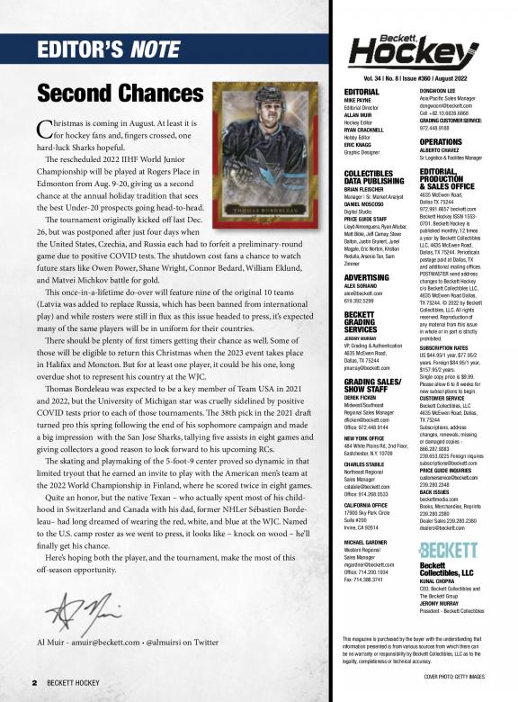 Beckett Hockey is a monthly magazine that features values on trading, including new releases. There are also articles on current trends, the latest releases and reviews of just-released products. Passionate readers use this magazine to find the worth of their cards, hot player and Rookie Cards to watch. Beckett Hockey is deal for longtime and novice collectors. Each issue has: • The Hockey Card Price Guide with more than 100 pages filled with values for past current releases. • The Hot List, a monthly guide with pricing and images for the top 20 hockey cards on the market • Articles with information on the latest trends and news in the hobby • Reviews of the latest hockey releases • Previews of upcoming products