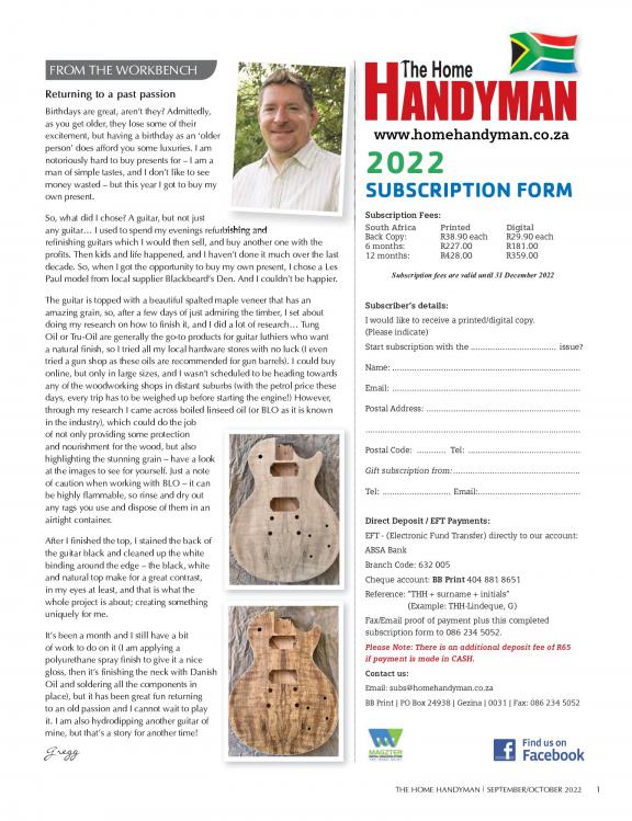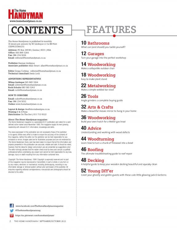 The Home Handyman magazine of South Africa is a specialized D.I.Y. publication and caters for a well-defined niche market since November 1993. Editorial includes new products for D.I.Y.’ers, along with projects, home improvement ideas and expert advice. Expert advice from various fields (such as adhesives, abrasives, power tools, welding, plumbing, paint, lighting, waterproofing, wood and metalworking), provides readers with simple, cost effective solutions and methods in a series of practical, step-by-step features that are comprehensively illustrated. All projects feature local products and metric measurements, making the ideas easy to implement.