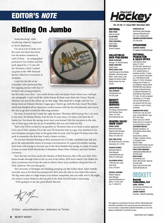 Beckett Hockey is a monthly magazine that features values on trading, including new releases. There are also articles on current trends, the latest releases and reviews of just-released products. Passionate readers use this magazine to find the worth of their cards, hot player and Rookie Cards to watch. Beckett Hockey is deal for longtime and novice collectors. Each issue has: • The Hockey Card Price Guide with more than 100 pages filled with values for past current releases. • The Hot List, a monthly guide with pricing and images for the top 20 hockey cards on the market • Articles with information on the latest trends and news in the hobby • Reviews of the latest hockey releases • Previews of upcoming products