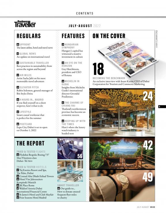 Business Traveller Middle East is the leading magazine for the corporate traveller. We aim to save you money and make your travelling life easier. Each edition has the latest news covering airlines, airports, hotels and car hire companies, regional and international destination features and updates on gadgets, technology and accessories.