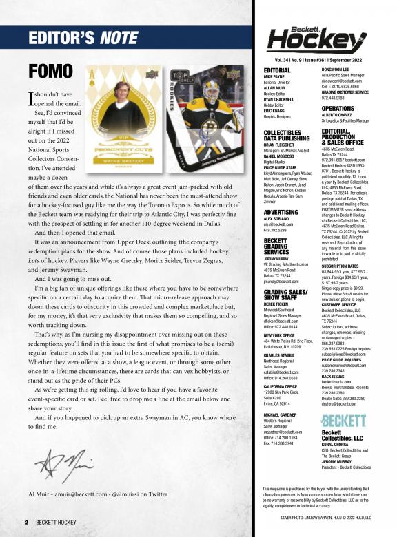 Beckett Hockey is a monthly magazine that features values on trading, including new releases. There are also articles on current trends, the latest releases and reviews of just-released products. Passionate readers use this magazine to find the worth of their cards, hot player and Rookie Cards to watch. Beckett Hockey is deal for longtime and novice collectors. Each issue has: • The Hockey Card Price Guide with more than 100 pages filled with values for past current releases. • The Hot List, a monthly guide with pricing and images for the top 20 hockey cards on the market • Articles with information on the latest trends and news in the hobby • Reviews of the latest hockey releases • Previews of upcoming products