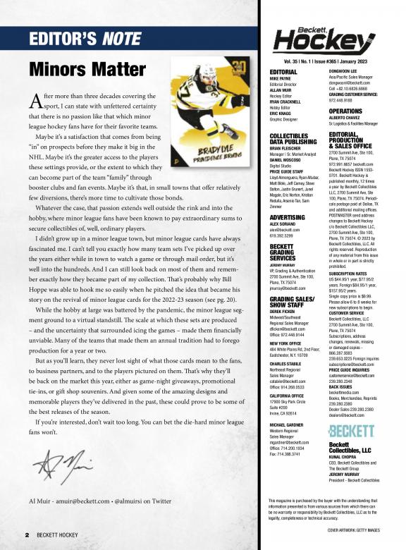 Beckett Hockey is a monthly magazine that features values on trading, including new releases. There are also articles on current trends, the latest releases and reviews of just-released products. Passionate readers use this magazine to find the worth of their cards, hot player and Rookie Cards to watch. Beckett Hockey is deal for longtime and novice collectors. Each issue has: • The Hockey Card Price Guide with more than 100 pages filled with values for past current releases. • The Hot List, a monthly guide with pricing and images for the top 20 hockey cards on the market • Articles with information on the latest trends and news in the hobby • Reviews of the latest hockey releases • Previews of upcoming products