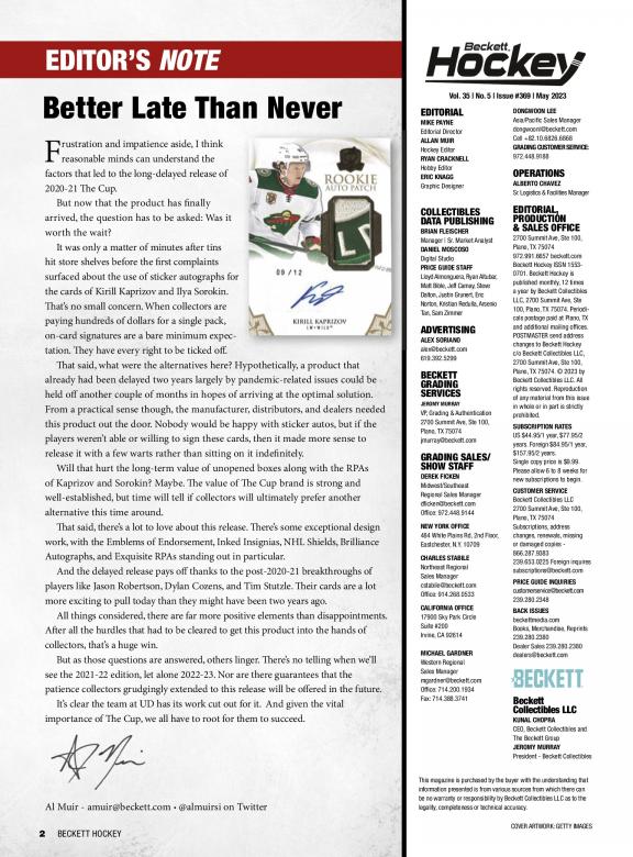 Beckett Hockey is a monthly magazine that features values on trading, including new releases. There are also articles on current trends, the latest releases and reviews of just-released products. Passionate readers use this magazine to find the worth of their cards, hot player and Rookie Cards to watch. Beckett Hockey is deal for longtime and novice collectors. Each issue has: • The Hockey Card Price Guide with more than 100 pages filled with values for past current releases. • The Hot List, a monthly guide with pricing and images for the top 20 hockey cards on the market • Articles with information on the latest trends and news in the hobby • Reviews of the latest hockey releases • Previews of upcoming products
