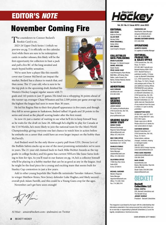 Beckett Hockey is a monthly magazine that features values on trading, including new releases. There are also articles on current trends, the latest releases and reviews of just-released products. Passionate readers use this magazine to find the worth of their cards, hot player and Rookie Cards to watch. Beckett Hockey is deal for longtime and novice collectors. Each issue has: • The Hockey Card Price Guide with more than 100 pages filled with values for past current releases. • The Hot List, a monthly guide with pricing and images for the top 20 hockey cards on the market • Articles with information on the latest trends and news in the hobby • Reviews of the latest hockey releases • Previews of upcoming products
