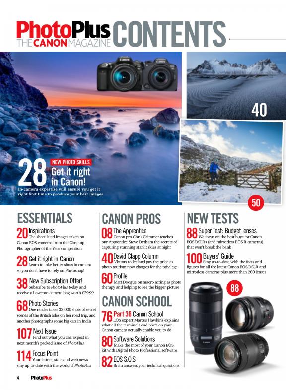 PhotoPlus: The Canon Magazine is a comprehensive resource for Canon photographers of all levels. Whether you're a beginner or a seasoned pro, you'll find something to learn in every issue. The magazine covers everything from buying and using Canon cameras and lenses to troubleshooting and repairing them. It also features interviews with Canon photographers, inspirational photography stories, and stunning photography. Here are some of the things you can expect in PhotoPlus: The Canon Magazine: * Buying guides: PhotoPlus: The Canon Magazine provides in-depth buying guides for Canon cameras and lenses. These guides will help you choose the right gear for your needs and budget. * Reviews: PhotoPlus: The Canon Magazine reviews the latest Canon cameras and lenses. These reviews are thorough and unbiased, and they will help you decide if a particular piece of gear is right for you. * Features: PhotoPlus: The Canon Magazine features articles on a variety of topics related to Canon photography. These topics include technique, composition, post-processing, and more. * Interviews: PhotoPlus: The Canon Magazine interviews Canon photographers, from beginners to professionals. These interviews provide insights into the photographers' work and their thoughts on Canon photography. * Photography stories: PhotoPlus: The Canon Magazine features photography stories from Canon photographers around the world. These stories are inspiring and informative, and they will help you learn new things about photography. * Stunning photography: PhotoPlus: The Canon Magazine features stunning photography from Canon photographers around the world. This photography is sure to inspire you and motivate you to take your own photography to the next level. If you're interested in learning more about Canon photography, then PhotoPlus: The Canon Magazine is the perfect magazine for you. Subscribe today and start exploring the world of Canon photography!