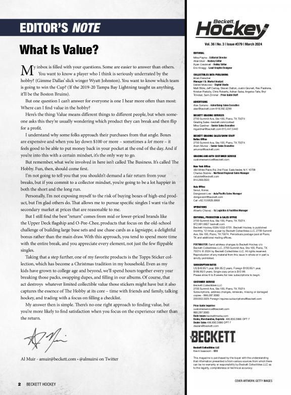 Beckett Hockey is a monthly magazine that features values on trading, including new releases. There are also articles on current trends, the latest releases and reviews of just-released products. Passionate readers use this magazine to find the worth of their cards, hot player and Rookie Cards to watch. Beckett Hockey is deal for longtime and novice collectors. Each issue has: • The Hockey Card Price Guide with more than 100 pages filled with values for past current releases. • The Hot List, a monthly guide with pricing and images for the top 20 hockey cards on the market • Articles with information on the latest trends and news in the hobby • Reviews of the latest hockey releases • Previews of upcoming products