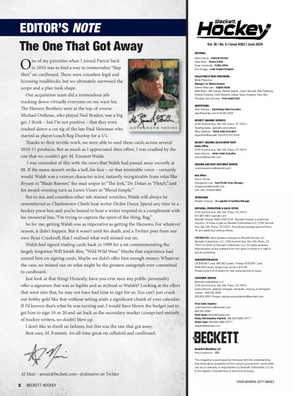 Beckett Hockey is a monthly magazine that features values on trading, including new releases. There are also articles on current trends, the latest releases and reviews of just-released products. Passionate readers use this magazine to find the worth of their cards, hot player and Rookie Cards to watch. Beckett Hockey is deal for longtime and novice collectors. Each issue has: • The Hockey Card Price Guide with more than 100 pages filled with values for past current releases. • The Hot List, a monthly guide with pricing and images for the top 20 hockey cards on the market • Articles with information on the latest trends and news in the hobby • Reviews of the latest hockey releases • Previews of upcoming products