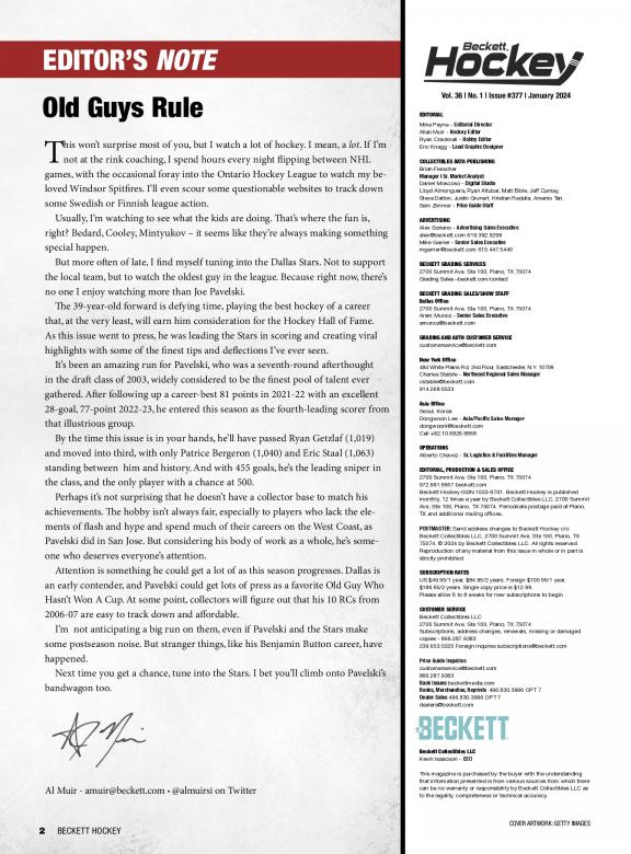 Beckett Hockey is a monthly magazine that features values on trading, including new releases. There are also articles on current trends, the latest releases and reviews of just-released products. Passionate readers use this magazine to find the worth of their cards, hot player and Rookie Cards to watch. Beckett Hockey is deal for longtime and novice collectors. Each issue has: • The Hockey Card Price Guide with more than 100 pages filled with values for past current releases. • The Hot List, a monthly guide with pricing and images for the top 20 hockey cards on the market • Articles with information on the latest trends and news in the hobby • Reviews of the latest hockey releases • Previews of upcoming products