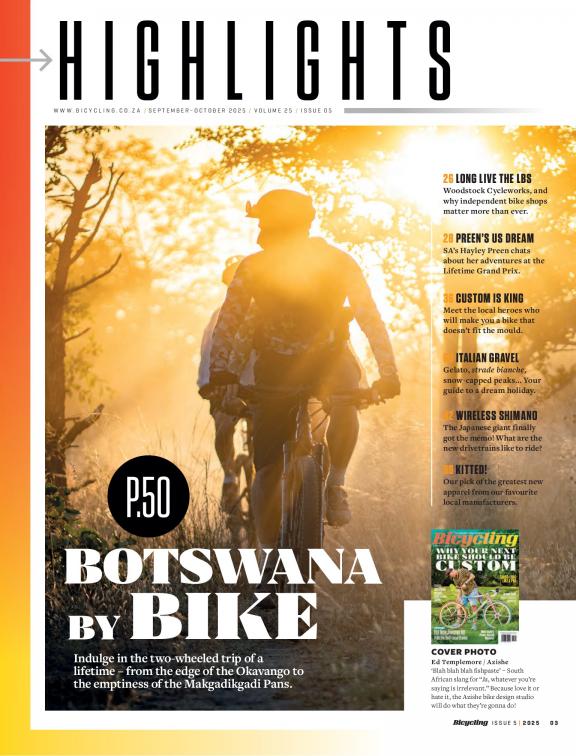 Bicycling is South Africa's leading cycling magazine and is aimed at both road and mountain biking enthusiasts. Launched in February 2003, it is published 10 times a year, targeting the fast-growing and affluent lifestyle cycling market youngsters, adults, professional as well as casual cyclists. The magazine is filled with the best international and local content for every element of the cyclist's life from training techniques and fitness information to inspiring human interest stories, event news, nutrition and motivation. Bicycling is also South Africa's leading tester of bikes and gear with over 30% of the monthly magazine dedicated to the latest reviews so our readers can make the best choices.