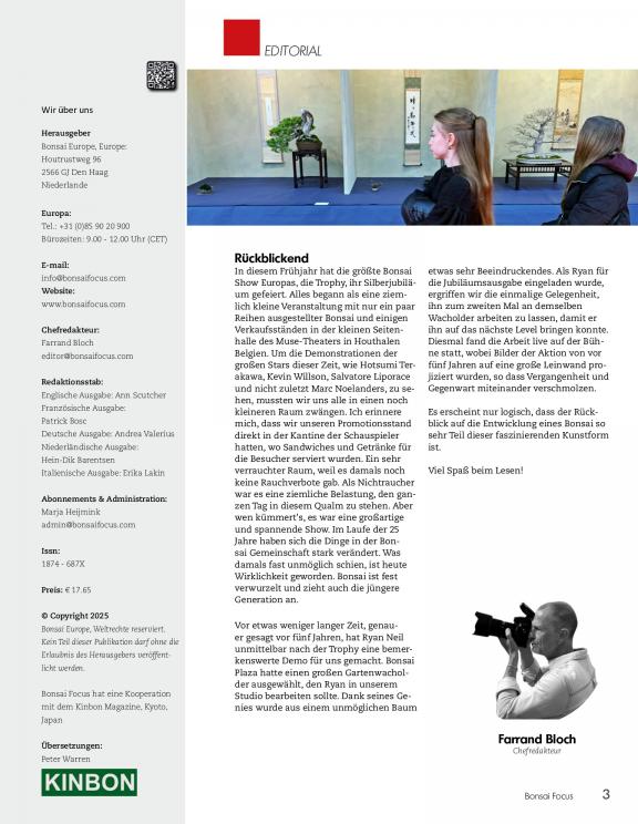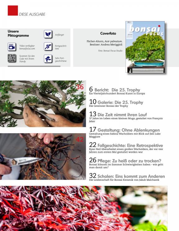 Entdecken Sie die fasinierenden Inhalte der Bonsai Focus! Mit vielen interessanten, informativen Reportagen und fantastischen Fotografien, erscheint das Magazin alle zwei Monate. Das Bonsai Focus Magazin zeigt Ihnen außergewöhnliche Bonsai, großartige Gestaltungen berühmter Meister, lehrreiche Techniken und brauchbare Pflege-Tips. Häufig gibt es zu den Artikeln exklusive und atemberaubende Videos.