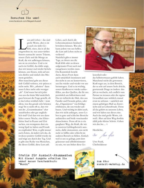 Das Magazin gibt Anregung und Inspiration auf dem Weg in die persönliche Balance und den Einklang mit der Natur. AUSZEIT verfolgt dabei einen ganzheitlichen Ansatz für Ausgewogenheit aus Ernährung, Spiritualität und Bewegung. Die Zeitschrift zur Horizonterweiterung und Inspiration liegt damit voll im aktuellen Trend und präsentiert Themen, die den Bogen vom „Natürlichen Wohnen“ über das „Natürliche Ernähren“ bis hin zum „Natürlichen Heilen und Entspannen“ schlagen. AUSZEIT zeigt sich dabei als Einheit aus ästhetischer Anmutung und hochwertigem Informationswert. Dem redaktionellen Anspruch wird die Zeitschrift mit gesellschaftlich relevanten Themen, spannenden Hintergrundartikeln, bildgewaltigen Reportagen sowie Dossier mit Wohlfühlcharakter für ein positives Lebensgefühl gerecht.