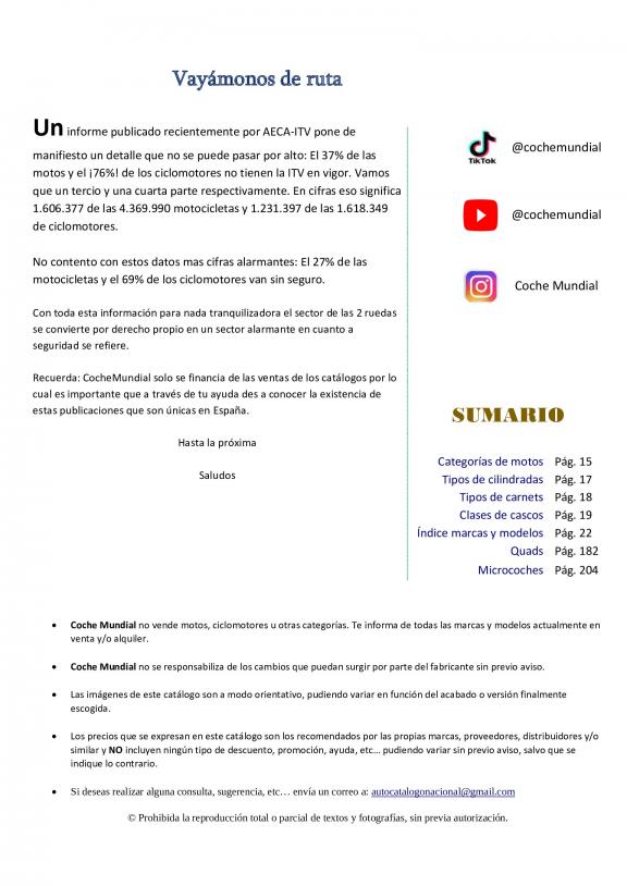 A 2RUEDAS ¿Te apasiona el mundo de las 2 Ruedas o estás pensando en comprar una? Si la respuesta es afirmativa, este es tu catálogo. Incluye los tipos de carnets, cascos, cilindradas, además, de las categorías. Sin olvidar la amplísima gama que tenemos con todas las marcas, modelos, especificaciones y una variedad de motos que no son las habituales.