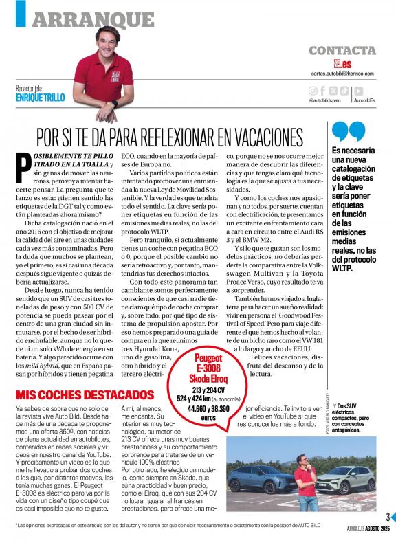 AUTO BILD ESPAñA La revista semanal generalista del motor más vendida en España. Dirigida a todos los apasionados del mundo del motor, que cautiva incluso a los lectores que no están habituados a comprar revistas de coches. Fiable y rigurosa en el tratamiento de la información. Es práctica, clara, sencilla y directa en sus temas. Ofrece al lector todo lo que le interesa: exclusivas sobre los nuevos lanzamientos y prototipos, test y comparativas en profundidad y los trucos y consejos más prácticos.