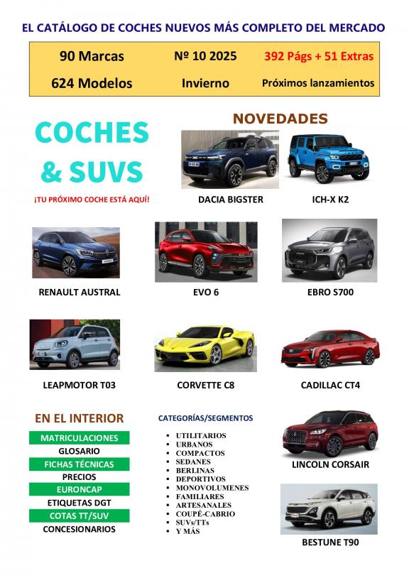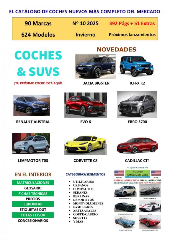 COCHES & SUVS España | Están llegando nuevas marcas y modelos, por tanto, si buscas un coche nuevo como si quieres saber la amplia variedad a la venta, aquí los encontrarás. En su interior incluye un glosario para no quedarte desfasado ante las nuevas tecnologías, especificaciones de cada modelo, país de fabricación, un listado con la red de ventas y mucho más. Es el catálogo más completo que existe, incluyendo imágenes del interior, frontal y posterior.