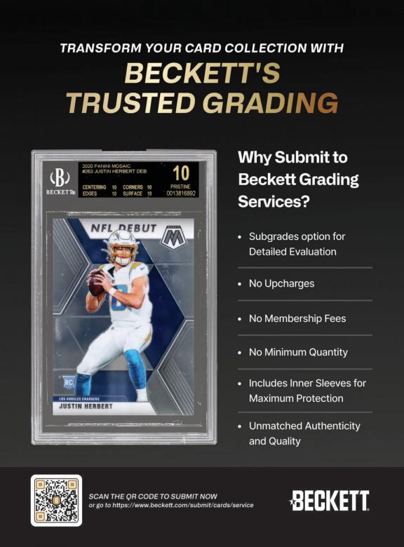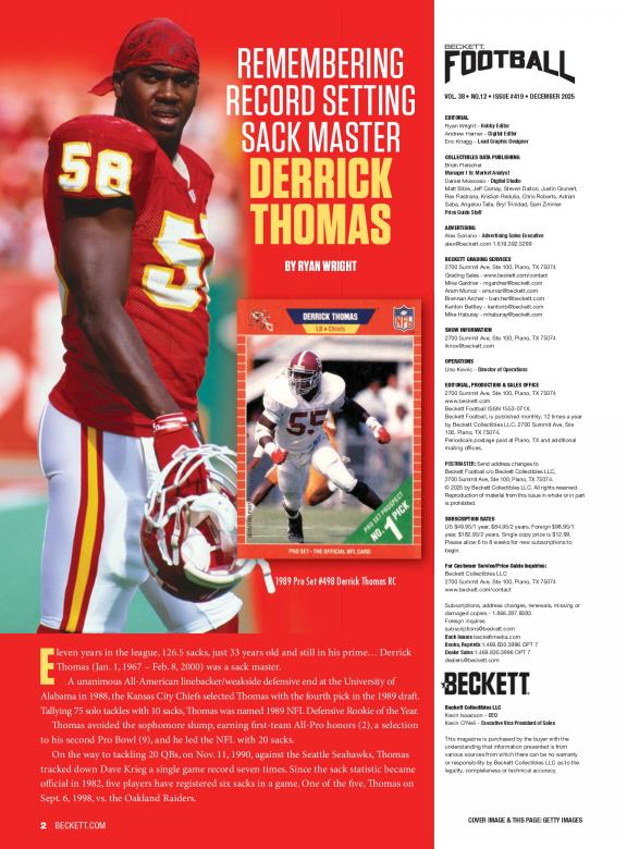 Dive into the exciting world of football collectibles and memorabilia with Beckett Football Magazine. We're thrilled to introduce you to this publication, your go-to source for all things related to football cards, collectibles, and the vibrant hobby of football memorabilia. Beckett Football Magazine, published by Beckett Collectibles LLC, is not just a magazine; it's your comprehensive guide to the world of football collectibles. As you explore the pages of Beckett Football Magazine, you'll find a world of content that caters to football collectors and fans alike: * Price Guides: Access up-to-date price guides for football cards, helping you stay informed about the value of your collectibles. * Card Reviews: Explore in-depth reviews of football cards, including insights into key players, rookie cards, and special editions. * Market Trends: Stay ahead of market trends and discover the latest developments in the football collectibles hobby. * Collector Features: Dive into features on passionate collectors, their prized football memorabilia, and their stories. * Expert Analysis: Benefit from expert analyses and commentary on the football collectibles market and industry. Beckett Football Magazine is your ultimate guide to navigating the world of football collectibles. Subscribe now and stay on top of the latest trends, values, and stories in the exciting hobby of football memorabilia.