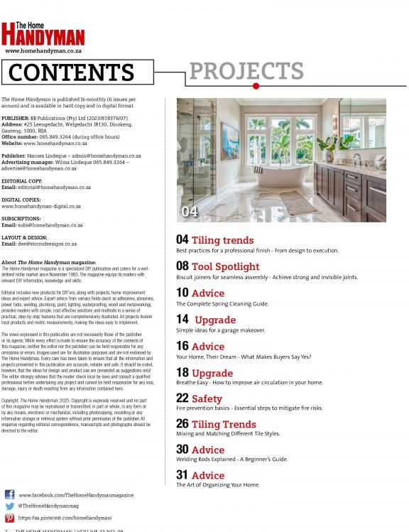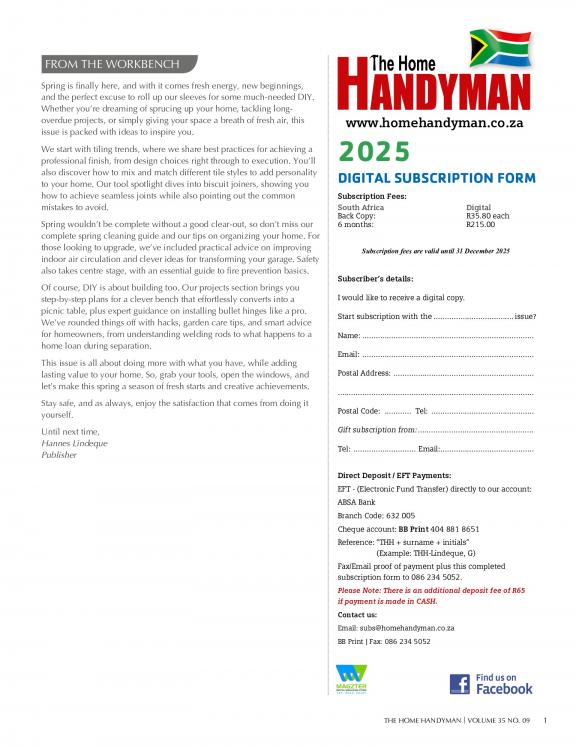 The Home Handyman magazine is a specialized D.I.Y. publication and caters for a well-defined niche market since November 1993. Editorial includes new products for D.I.Y.’ers, along with projects, home improvement ideas and expert advice. Expert advice from various fields (such as adhesives, abrasives, power tools, welding, plumbing, paint, lighting, waterproofing, wood and metalworking), provides readers with simple, cost effective solutions and methods in a series of practical, step-by-step features that are comprehensively illustrated. All projects feature local products and metric measurements, making the ideas easy to implement.