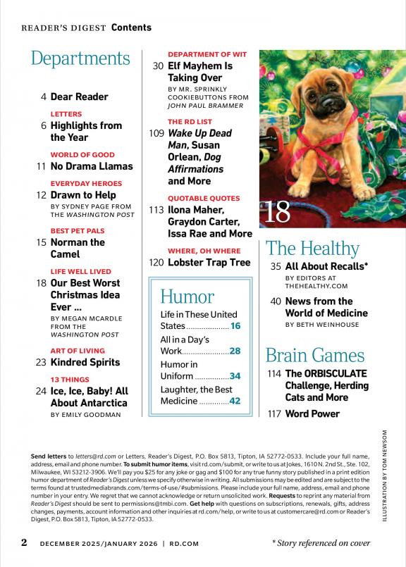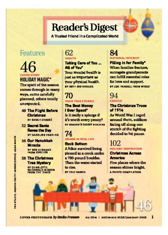 Experience the magic of Reader's Digest US and unlock a treasure trove of captivating stories, fascinating articles, and practical insights. For decades, Reader's Digest has been a trusted companion, bringing joy, inspiration, and valuable insights to millions of readers. Each issue is filled with a diverse range of content, including real-life stories of courage and resilience, health and wellness tips, practical advice, and engaging features that celebrate the beauty of life. With a Reader's Digest US subscription, you'll receive monthly deliveries of uplifting and informative content that will brighten your day and expand your horizons. From inspiring personal accounts to expertly curated content across a variety of topics, Reader's Digest is the perfect companion for those seeking both entertainment and enlightenment. Join the millions of readers who have embraced the joy of Reader's Digest US. Subscribe today and immerse yourself in a world of discovery, laughter, and meaningful connections.