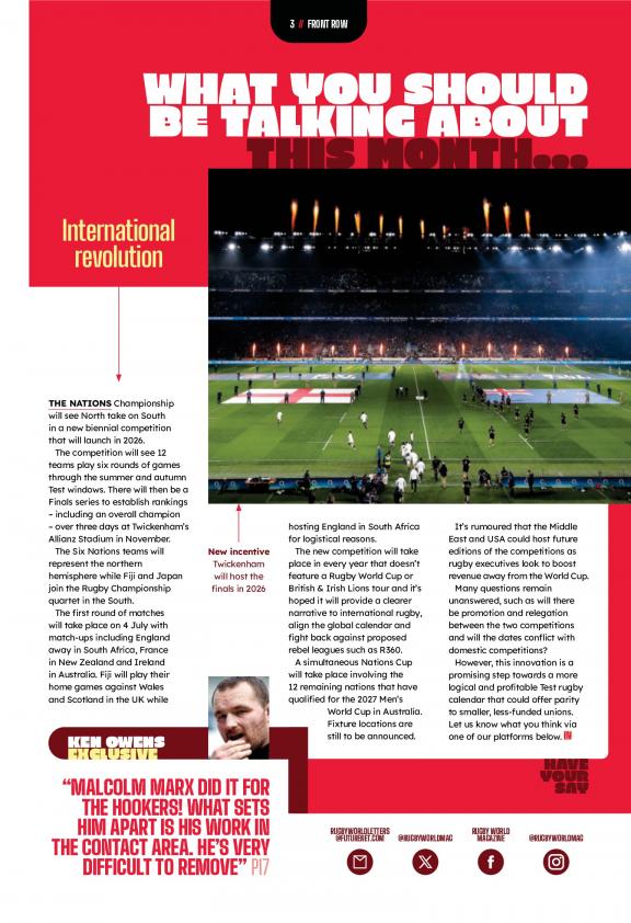 Rugby World Magazine is a monthly rugby union magazine running since October 1960. It is published monthly by Future plc and edited by Owain Jones who took over from long-standing editor Paul Morgan in January 2012. The magazine covers all aspects of rugby union, from news and features to player profiles and match reports. It also features exclusive interviews with rugby stars and legends. Rugby World Magazine is a popular read for many rugby fans, and is known for its in-depth coverage and expert analysis. It has helped many rugby fans stay up-to-date on the latest news and trends in the sport. Here are some of the things you can expect from Rugby World Magazine: * News and features on rugby union * Player profiles and match reports * Exclusive interviews with rugby stars and legends * A lively and informative writing style * Stunning photography of rugby matches and players If you're looking for a magazine that will help you stay up-to-date on the latest rugby union news and trends, then Rugby World Magazine is a good choice. Subscribe today and start enjoying the best of rugby!