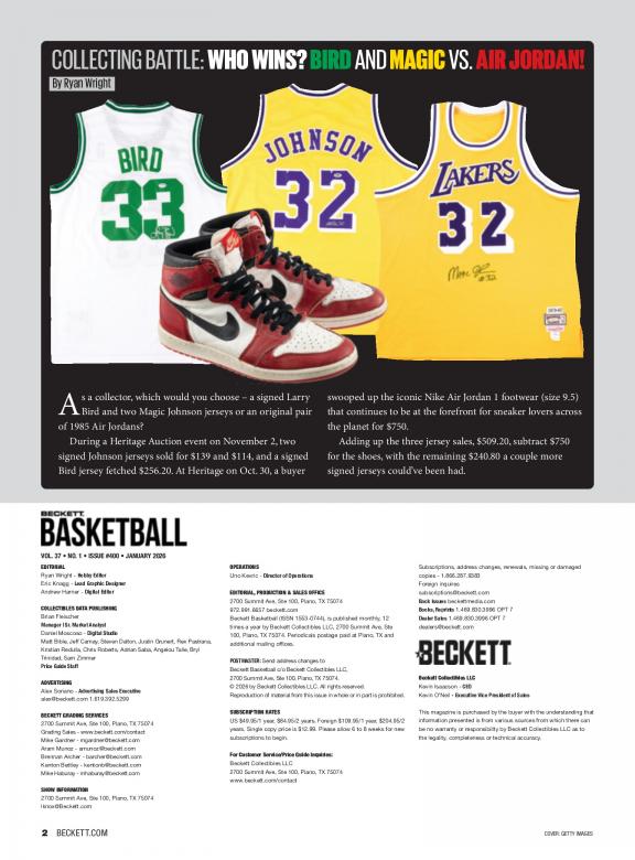 Step into the thrilling world of basketball collectibles and memorabilia with Beckett Basketball Magazine. We're excited to introduce you to this publication, your go-to source for all things related to basketball cards, collectibles, and the vibrant hobby of basketball memorabilia. Beckett Basketball Magazine, published by Beckett Collectibles LLC, is not just a magazine; it's your comprehensive guide to the world of basketball collectibles. As you explore the pages of Beckett Basketball Magazine, you'll find a world of content that caters to basketball collectors and fans alike: * Price Guides: Access up-to-date price guides for basketball cards, helping you stay informed about the value of your collectibles. * Card Reviews: Explore in-depth reviews of basketball cards, including insights into key players, rookie cards, and special editions. * Market Trends: Stay ahead of market trends and discover the latest developments in the basketball collectibles hobby. * Collector Features: Dive into features on passionate collectors, their prized basketball memorabilia, and their stories. * Expert Analysis: Benefit from expert analyses and commentary on the basketball collectibles market and industry. Beckett Basketball Magazine is your ultimate guide to navigating the world of basketball collectibles. Subscribe now and stay on top of the latest trends, values, and stories in the exciting hobby of basketball memorabilia.