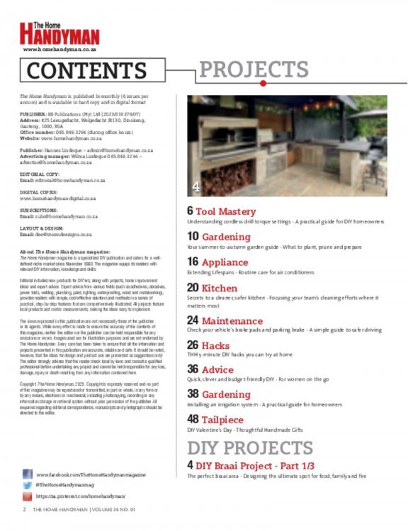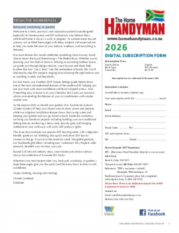 The Home Handyman magazine is a specialized D.I.Y. publication and caters for a well-defined niche market since November 1993. Editorial includes new products for D.I.Y.’ers, along with projects, home improvement ideas and expert advice. Expert advice from various fields (such as adhesives, abrasives, power tools, welding, plumbing, paint, lighting, waterproofing, wood and metalworking), provides readers with simple, cost effective solutions and methods in a series of practical, step-by-step features that are comprehensively illustrated. All projects feature local products and metric measurements, making the ideas easy to implement.