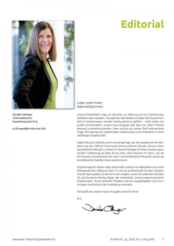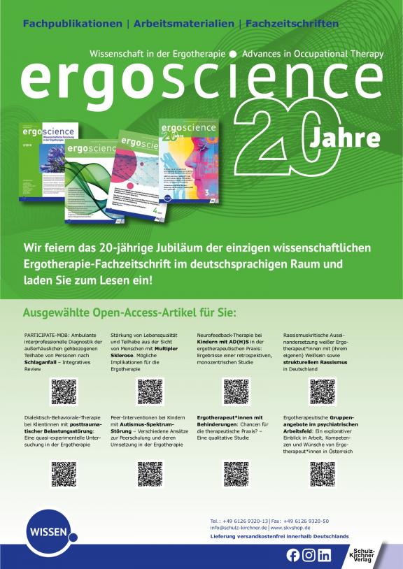 ERGOTHERAPIE UND REHBILITATION - Die führende Fachzeitschrift für Ergotherapie. Offizielles Organ des Deutschen Verbandes der Ergotherapeuten e.V. Die Fachzeitschrift zählt nicht nur bei den Mitgliedern des Deutschen Verbandes der Ergotherapeuten e.V. zur Pflichtlektüre. Darüber hinaus hat sie einen großen festen Abonnentenstamm, bestehend z.B. aus Kliniken, Praxen, medizinischen Schulungseinrichtungen und Rehabilitationszentren. Die Zeitschrift findet als fachwissenschaftliche Informationsquelle weithin Beachtung. Führende Praktiker und anerkannte Wissenschaftler schreiben in aktuellen und interessanten Beiträgen über die Ergebnisse ihrer therapeutischen Arbeit.