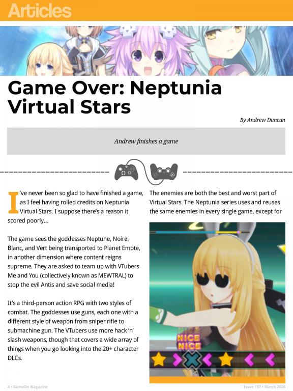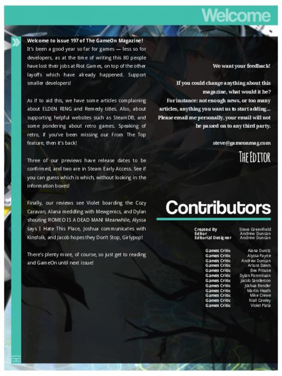 GameOn Magazine is a monthly video game magazine that focuses on everything gaming, from Xbox One, PlayStation 4 and PC. Reviews of games out, previews of games not out yet, interviews with development teams and gaming article, each month is packed with over 30 different features. GameOn Magazine is published by GameOn Networking Ltd. and is available in the UK, the US, in mainland Europe, Australia, New Zealand, South Africa and many other countries. GameOn Magazine features articles on a variety of topics, such as: * Reviews: Reviews of the latest video games, from AAA blockbusters to indie gems. * Previews: Previews of upcoming video games, giving you a sneak peek at what's to come. * Interviews: Interviews with developers, designers, and other industry insiders. * Features: Articles on a variety of gaming-related topics, such as history, culture, and technology. * Columns: Columns by leading gaming journalists and personalities. * Tips and tricks: Tips and tricks to help you improve your gaming skills. GameOn Magazine is a great resource for anyone who loves video games. It is packed with information and inspiration, and it is a must-read for any gamer. Subscribe today and stay up-to-date on the latest gaming news and trends!