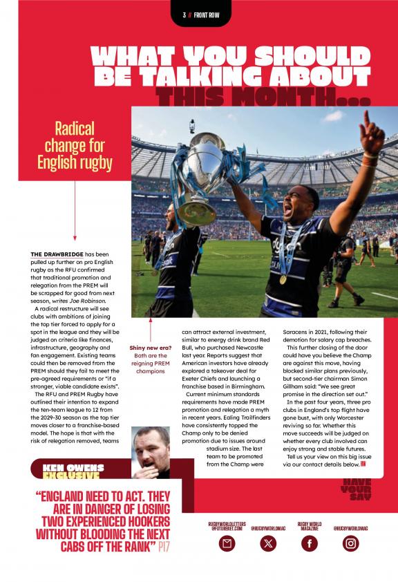 Rugby World Magazine is a monthly rugby union magazine running since October 1960. It is published monthly by Future plc and edited by Owain Jones who took over from long-standing editor Paul Morgan in January 2012. The magazine covers all aspects of rugby union, from news and features to player profiles and match reports. It also features exclusive interviews with rugby stars and legends. Rugby World Magazine is a popular read for many rugby fans, and is known for its in-depth coverage and expert analysis. It has helped many rugby fans stay up-to-date on the latest news and trends in the sport. Here are some of the things you can expect from Rugby World Magazine: * News and features on rugby union * Player profiles and match reports * Exclusive interviews with rugby stars and legends * A lively and informative writing style * Stunning photography of rugby matches and players If you're looking for a magazine that will help you stay up-to-date on the latest rugby union news and trends, then Rugby World Magazine is a good choice. Subscribe today and start enjoying the best of rugby!