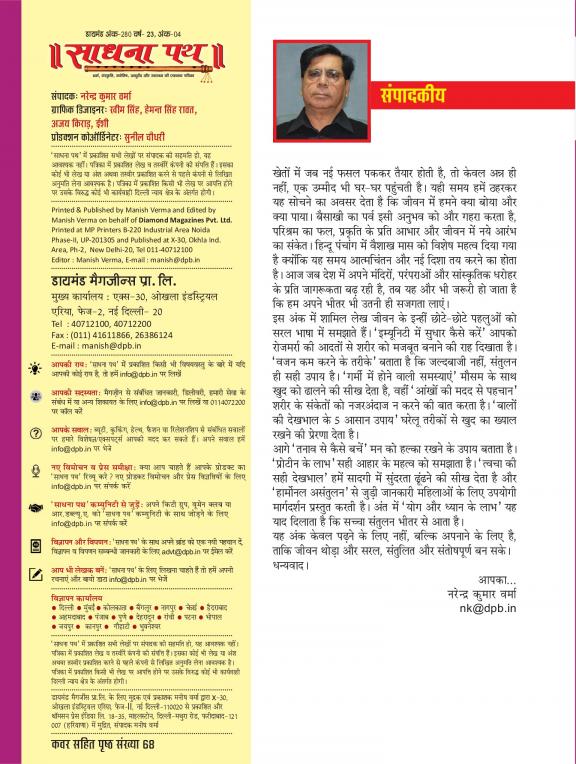 Sadhna Path is a health and wellness magazine which also covers spirituality and ayurveda in collaboration with Sadhna Channel. Sadhna Path is an endeavour taken under the aegis of Diamond magazines, to make discerning and callous people stop aping the West blindly and realise their country's worth. It is a monthly Hindi transformative magazine being published for the last eight years, covering religion, astrology, spirituality, vaastu and Feng Shui. It is a complete magazine for your mind, body and soul.